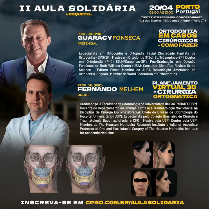 Com os temas “ORTODONTIA EM CASOS CIRÚRGICOS – Como Fazer” com o Professor Dr. (PhD) Guaracy Fonseca, e ”PLANEJAMENTO VIRTUAL 3D – CIRURGIA ORTOGNÁTICA” com o Prof. Dr. (PhD) Fernando Melhem.