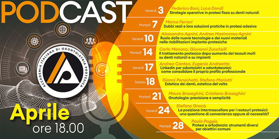 Un format per molti versi inedito, che abbina l’agilità, la diffusione e l’interattività dei social media con l’autorevolezza dei contenuti di Aiop. Nel mese di aprile 2020 hanno preso il via i Podcast interattivi di Aiop, una serie di appuntamenti su Facebook e Youtube con alcuni dei maggiori esperti del panorama odontoiatrico ed odontotecnico, selezionati tra i relatori AIOP, con la possibilità per chi segue i video di porre domande in diretta. Martedì e venerdì i giorni in cui sono programmati i podcast, con inizio alle 18.00, con la presenza dei relatori e di un moderatore con funzione di discussant.